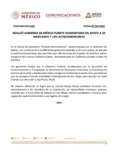 COMUNICADO 083. REALIZÓ GOBIERNO DE MÉXICO PUENTE HUMANITARIO EN APOYO A 33 MEXICANOS Y 149 LATINOAMERICANOS
